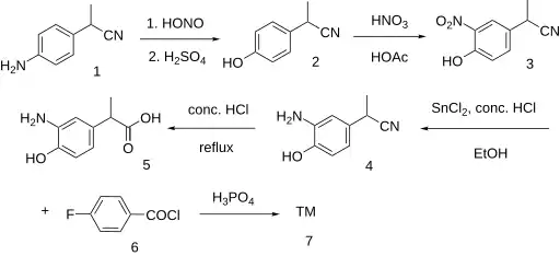A Sandmeyer reaction by diazotisation of 2-(4-aminophenyl)propanenitrile (1) followed by acid hydrolysis leads to the phenol (2), which is nitrated and reduced using stannous chloride or catalytic hydrogenation to give the aminophenol (4). Hydrolysis of the nitrile produces the carboxylic acid (5), which is converted to racemic flunoxaprofen by acylation with p-fluorobenzoyl chloride, followed by cyclisation.[1][2][3][4]