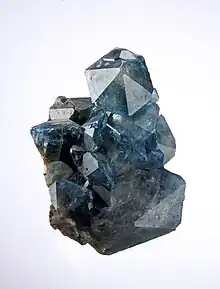 Fluorapatite, often with the alternate spelling of fluoroapatite, is a phosphate mineral with the formula Ca5(PO4)3F (calcium fluorophosphate). Fluorapatite is a hard crystalline solid. Although samples can have various color (green, brown, blue, yellow, violet, or colorless), the pure mineral is colorless, as expected for a material lacking transition metals. Along with hydroxylapatite, it can be a component of tooth enamel, especially in individuals who use fluoridated toothpaste, but for industrial use both minerals are mined in the form of phosphate rock, whose usual mineral composition is primarily fluorapatite but often with significant amounts of the other.[5]