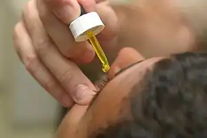 ![]() Fluorescein drops being put in the eye before examination | |