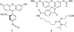 In oligonucleotide synthesis, several phosphoramidite reagents containing protected fluorescein, e.g. 6-FAM phosphoramidite 2,[20] are used for the preparation of fluorescein-labeled oligonucleotides.