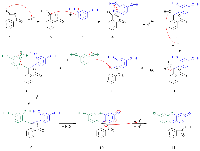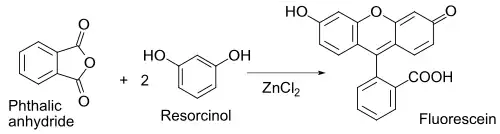 Approximately 250 tons were produced in the year 2000. The method involves the fusion of phthalic anhydride and resorcinol,[1] similar to the route described by Adolf von Baeyer in 1871.[21] In some cases, acids such as zinc chloride and methanesulfonic acid are employed to accelerate the Friedel-Crafts reaction.[22][23]