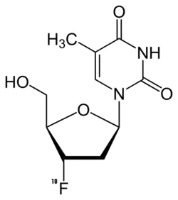 Fluorothymidine F-18 (FLT) is a tumor-specific PET tracer and radiopharmaceutical. It is an isotopologue of alovudine. FLT is suitable for monitoring how tumors respond to cytostatic therapy. FLT accumulates in proliferating cells where it indicates the activity of the enzyme thymidine kinase. Cell division can be characterized by the activity of that enzyme. FLT is phosphorylated as though it were thymidine, and is subsequently incorporated into DNA. Thymidine is essential for DNA replication. Considering that FLT lacks a 3′-hydroxy group, transcription of DNA is impeded following incorporating of FLT. FLT indicates changes in tumor cell proliferation by tracking the restoration of nucleosides from degenerated DNA.[1]