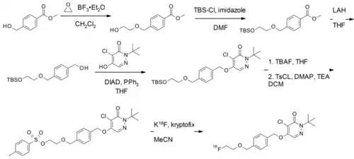 Methyl p-(hydroxymethyl)benzoate undergoes reaction with ethylene oxide with boron trifluoride etherate and dichloromethane to yield 2-hydroxyethyl ether. Then, the hydroxy group is substituted with tert-butyldimethylsilyl chloride (TMS-Cl) in dimethylformamide (DMF). Next, the ester is reduced into an according alcohol using lithium aluminium hydride (LAH) in tetrahydrofuran. The newly created hydroxy moiety undergoes addition with 2-tert-butyl-4-chloro-5-hydroxy-pyridazin-3-one. The TBSO group is then substituted with a tosyl group with a two-step reaction using (1) tetra-n-buthylammonium fluoride (TBAF) in THF and (2) tosyl chloride in 4-dimethylaminopyridine (DMAP), triethylamine (TEA) and dichloromethane. To create the final radiolabelled radiopharmaceutical, potassium fluoride-18 is used. This step is performed using kryptofix, a phase-transfer catalyst, and acetonitrile. Kryptofix (5-decyl-4,7,13,16,21-pentaoxa-1,10-diazabicyclo[8.8.5]tricosane), a cryptand, increases the solubility of the fluoride ion in organic solvents (here, acetonitrile), by chelating it.