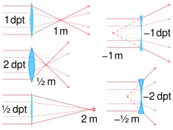 In optics, optical power (also referred to as dioptric power, refractive power, focal power, focusing power, or convergence power) is the degree to which a lens, mirror, or other optical system converges or diverges light.[1] It is equal to the reciprocal of the focal length of the device; high optical power corresponds to short focal length. The SI unit for optical power is the inverse metre (mโˆ’1), which is also called a dioptre (symbol: dpt or D) when used as a unit of optical power.