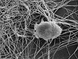 Follicular dendritic cells (FDC) are cells of the immune system found in primary and secondary lymph follicles (lymph nodes) of the B cell areas of the lymphoid tissue.[1][2][3] Unlike dendritic cells (DC), FDCs are not derived from the bone-marrow hematopoietic stem cell, but are of mesenchymal origin.[4] Possible functions of FDC include: organizing lymphoid tissue's cells and microarchitecture, capturing antigen to support B cell, promoting debris removal from germinal centers, and protecting against autoimmunity. Disease processes that FDC may contribute include primary FDC-tumor, chronic inflammatory conditions, HIV-1 infection development, and neuroinvasive scrapie.