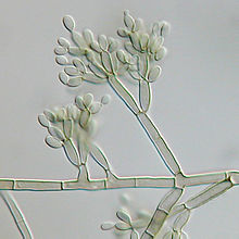 Sparingly branched, brownish conidiophores produce clusters of 1–celled, club-shaped conidia in short, dry, unbranched chains. A Phialophora-like asexual state sometimes appears along with yeast cells at low pH.[6]