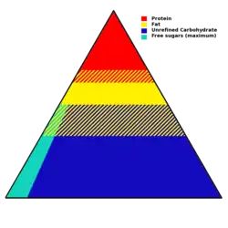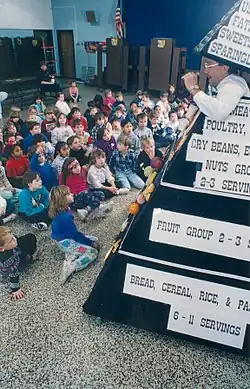 A food pyramid is a representation of the optimal number of servings to be eaten each day from each of the basic food groups.[2] The first pyramid was published in Sweden in 1974.[3][4][5] The 1992 pyramid introduced by the United States Department of Agriculture (USDA) was called the "Food Guide Pyramid" or "Eating Right Pyramid". It was updated in 2005 to "MyPyramid", and then it was replaced by "MyPlate" in 2011.[6][7]