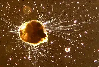 Most foraminifera are heterotrophic, consuming smaller organisms and organic matter; some smaller species are specialised feeders on phytodetritus, while others specialise in consuming diatoms. Some benthic forams construct feeding cysts, using the pseuodopodia to encyst themselves inside of sediment and organic particles.[24] Certain foraminifera prey upon small animals such as copepods or cumaceans; some forams even predate upon other forams, drilling holes into the tests of their prey.[48] One group, the xenophyophores, has been suggested to farm bacteria within their tests, although studies have failed to find support for this hypothesis.[49] Suspension feeding is also common in the group, and at least some species can take advantage of dissolved organic carbon.[24]