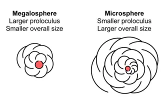 Foraminifera exhibit morphological dimorphism associated with their reproductive cycle. The gamont, or sexually reproducing haploid form, is megalospheric—that is, its proloculus, or first chamber, is proportionally large. The gamont is also known as the A form. Gamonts, despite having typically larger proloculi, also generally have smaller overall test diameter than do agamonts.