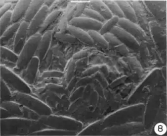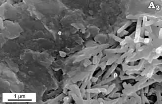 One genus, Miliammellus, has a non-perforated test made of opaline silica.[29] It is similar in shape and structure to the porcelanous tests of typical miliolids; the test consists of an internal and external organic layer, as well as a middle silica layer made of elongate rods. This silica layer is further divided into outer, middle, and inner subunits; the outer and inner subunits each are approximately 0.2μm thick and consist of subparallel sheets of silica rods with their long axes parallel to the test surface. The middle subunit is approximately 18μm in thickness and consists of a three-dimensional lattice of silica rods with no organic component in the open space. The ultrastructure differs from that of miliolids in that the rods are over twice as long and twice as thick on average, in that the rods of Miliammellus are hollow rather than solid, and of course in having a silica test rather than calcite.[30]