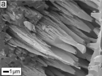 Lagenid tests consist of "fibre bundles" that can reach tens of micrometres long; each "bundle" is formed from a single calcite crystal, is triangular in cross-section, and has a pore in the centre (thought to be an artefact of test deposition). There is also an internal organic layer, attached to the "cone" structure of the fibre bundles. As the crystalline structure varies significantly from that of other calcareous foraminifera, it is thought to represent a separate evolution of the calcareous test. The exact mineralisation process of lagenids remains unclear.[24]