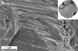 Rotaliid tests are described as "hyaline". They are formed from low-to-high-magnesium calcite "nanograins" positioned with their C-axes perpendicular to the external surface of the test. Further, these nanograins can have higher-level structure, such as rows, columns, or bundles.[20] The test wall is characteristically bilamellar (two-layered) and perforated throughout with small pores. The outer calcite layer of the test wall is referred to as the "outer lamina" while the inner calcite layer is referred to as the "inner lining"; this should not be confused with the organic inner lining beneath the test. Sandwiched between the outer lamina and the inner lining is the "median layer", a protein layer that separates the two. The median layer is quite variable; depending on the species it may be well-defined while in others it is not sharply delineated. Some genera may contain sediment particles within the median layer.[11][25][24]