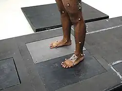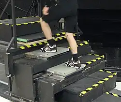 Force platforms may be classified as single-pedestal or multi-pedestal and by the transducer (force and moment transducer) type: strain gauge, piezoelectric sensors, capacitance gauge, piezoresistive, etc., each with its advantages and drawbacks.[3] Single pedestal models, sometimes called load cells, are suitable for forces that are applied over a small area. For studies of movements, such as gait analysis, force platforms with at least three pedestals and usually four are used to permit forces that migrate across the plate. For example, during walking ground reaction forces start at the heel and finish near the big toe.[2]