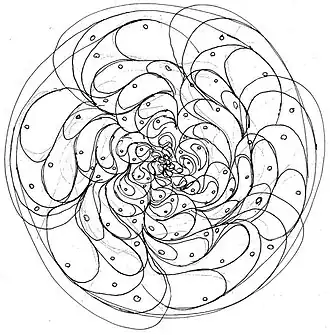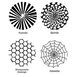 [Klüver’s] analysis of hallucinatory phenomena appearing chiefly during the first stages of mescaline intoxication yielded the following form constants: [emphasis original] (a) grating, lattice, fretwork, filigree, honeycomb, or chessboard; (b) cobweb; (c) tunnel, funnel, alley, cone or vessel; (d) spiral. Many phenomena are, on close examination, nothing but modifications and transformations of these basic forms. The tendency towards "geometrization," as expressed in these form constants, is also apparent in the following two ways: (a) the forms are frequently repeated, combined, or elaborated into ornamental designs and mosaics of various kinds; (b) the elements constituting these forms, such as squares in the chessboard design, often have boundaries consisting of geometric forms.[3]