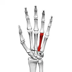 ![]() Fourth metacarpal of the left hand (shown in red). Palmar view. | |