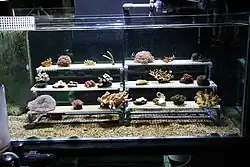 Corals can be multiplied in aquaria by attaching "frags" from a mother colony to a suitable substrate, such as a ceramic plug or a piece of live rock. This aquarium is designed specifically for growing coral colonies from frags.