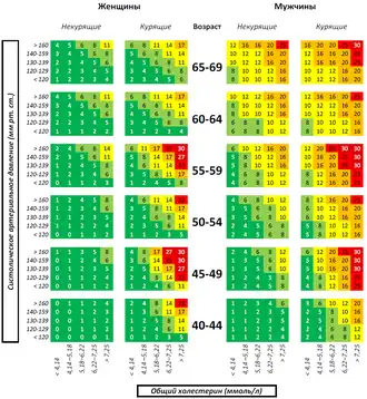 - ↑ Conroy RM, Pyorala K, Fitzgerald AP, Sans S, Menotti A, De Backer G, De Bacquer D, Ducimetiere P, Jousilahti P, Keil U, Njolstad I, Oganov RG, Thomsen T, Tunstall-Pedoe H, Tverdal A, Wedel H, Whincup P, Wilhelmsen L, Graham IM (Jun 2003). "Estimation of ten-year risk of fatal cardiovascular disease in Europe: the SCORE project". Eur Heart J. 24 (11): 987–1003. doi:10.1016/s0195-668x(03)00114-3. PMID 12788299.
