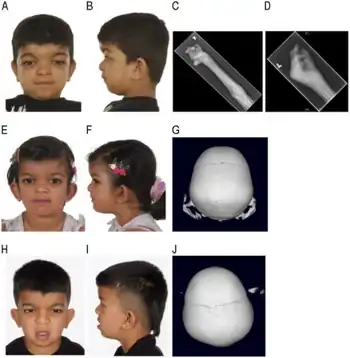 | A-D: Person 1.A: Antero-posterior (AP) view showing facial features including hypertelorism. B: Lateral view showing brachycephaly and micrognathia. C: X-ray (XR) right radius/ulna showing broad appearance of the radius at the junction between the proximal and middle thirds. D: XR left hand showing crowding of the carpal bones, broad metacarpals, proximal and middle phalanges, and flexion at the MCP and PIP joints. E-G: Person 2.E: AP view showing facial features including hypertelorism. F: Lateral view showing brachycephaly. G: 3D CT scan showing absence of the sagittal suture. H-J: Person 3.H: AP view showing facial features including hypertelorism. I: Lateral view showing class III malocclusion and brachycephaly. J: 3D CT scan showing absence of the sagittal suture. | |