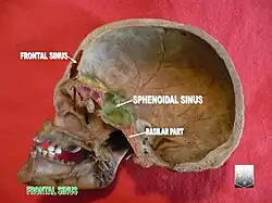 ![]() Outline of bones of face, showing position of air sinuses. Frontal sinus is shown in green. | |