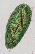 | Frontonia sp., specimen is digesting cyanobacteria, the mouth (cytostome) is at the bottom right. | |