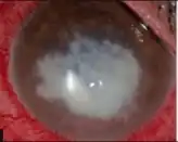 Fungal keratitis is a fungal infection of the cornea, which can lead to blindness.[2] It generally presents with a red, painful eye and blurred vision.[1] There is also increased sensitivity to light, and excessive tears or discharge.[1]