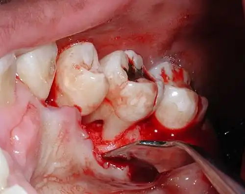 Bone loss from aggressive periodontitis that led to an exposed furcation on an upper molar. In health, the bone exists about a millimeter and a half away from the cementoenamel junction, which is the line that separates the crown from the root trunk (the line can be seen clearly in the photo).
