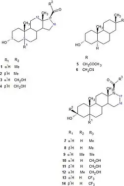 - ↑ Covey DF, Han M, Kumar AS, de La Cruz MA, Meadows ES, Hu Y, Tonnies A, Nathan D, Coleman M, Benz A, Evers AS, Zorumski CF, Mennerick S (Aug 2000). "Neurosteroid analogues. 8. Structure-activity studies of N-acylated 17a-aza-D-homosteroid analogues of the anesthetic steroids (3alpha, 5alpha)- and (3alpha,5beta)-3-hydroxypregnan-20-one". Journal of Medicinal Chemistry. 43 (17): 3201–4. doi:10.1021/jm0002477. PMID 10966737.
