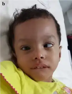 | Photo of person with GLyT1 Encephalopathy, with decreased size of head, inward turning cross eye, receding lower jaw, deep prominent philtrum, thin eyebrows. | |