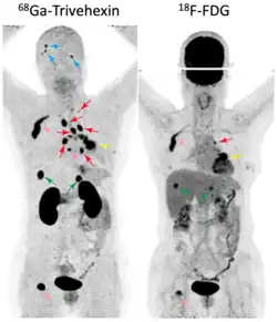 - ↑ Kömek H, Güzel Y, Kaplan İ, Yilmaz EE, Can C (November 2024). "Superiority of 68 Ga-Trivehexin PET/CT Over 18 F-FDG PET/CT in the Evaluation of Lymph Nodes in Patients With Breast Cancer". Clinical Nuclear Medicine. 50 (3): e175 – e177. doi:10.1097/RLU.0000000000005585. PMID 39601487.