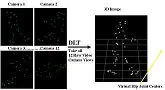 - Passive marker systems, using reflective markers (typically reflective balls), allows for accurate measurement of movements using multiple cameras (typically five to twelve cameras), simultaneously. The cameras utilize high-powered strobes (typically red, near infrared or infrared) with matching filters to record the reflection from the markers placed on the body. Markers are located at palpable anatomical landmarks. Based on the angle and time delay between the original and reflected signal, triangulation of the marker in space is possible. Software is used to create three dimensional trajectories from these markers that are subsequently given identification labels. A computer model is then used to compute joint angles from the relative marker positions of the labeled trajectories.[13] These are also used for motion capture in the motion picture industry.[14]