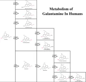 - ↑ 23.0 23.1 23.2 23.3 23.4 23.5 23.6 Mannens GS, Snel CA, Hendrickx J, Verhaeghe T, Le Jeune L, Bode W, et al. (May 2002). "The metabolism and excretion of galantamine in rats, dogs, and humans". Drug Metabolism and Disposition. 30 (5): 553–63. doi:10.1124/dmd.30.5.553. PMID 11950787.