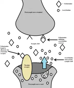 Alzheimer's disease is characterized by the impairment of cholinergic function.[7] One hypothesis is that this impairment contributes to the cognitive deficits caused by the disease. This hypothesis forms the basis for use of galantamine as a cholinergic enhancer in the treatment of Alzheimer's.[7] Galantamine inhibits acetylcholinesterase, an enzyme which hydrolyzes acetylcholine.[7] As a result of acetylcholinesterase inhibition, galantamine increases the availability of acetylcholine for synaptic transmission.[13] Additionally, galantamine binds to the allosteric sites of nicotinic receptors, which causes a conformational change.[14] This allosteric modulation increases the nicotinic receptor's response to acetylcholine.[13] The activation of presynaptic nicotinic receptors increases the release of acetylcholine, further increasing the availability of acetylcholine.[13] Galantamine's competitive inhibition of acetylcholinesterase and allosteric nicotinic modulation serves as a dual mechanism of action.[14]