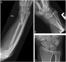 - ↑ Hughston, JC (April 1957). "Fracture of the distal radial shaft; mistakes in management". J Bone Joint Surg Am. 39-A (2): 249–64. doi:10.2106/00004623-195739020-00002. PMID 13416321.