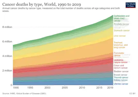 - ↑ "CDC - Gallbladder Cancer Incidence and Death Rates". www.cdc.gov. 2018-09-27. Archived from the original on 2020-01-03. Retrieved 2018-12-10.