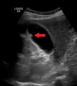Adenomyomatosis describes a diseased state of the gallbladder in which the gallbladder wall is excessively thick, due to proliferation of subsurface cellular layer. It is characterized by deep folds into the muscularis propria. Ultrasonography may reveal the thickened gallbladder wall with intramural diverticulae, called Rokitansky-Aschoff sinuses.[3]