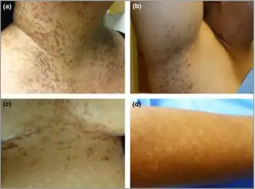 - ↑ 1.0 1.1 1.2 1.3 1.4 1.5 James, William D.; Elston, Dirk; Treat, James R.; Rosenbach, Misha A.; Neuhaus, Isaac (2020). "36. Disturbances of pigmentation". Andrews' Diseases of the Skin: Clinical Dermatology (13th ed.). Edinburgh: Elsevier. p. 866. ISBN 978-0-323-54753-6. Archived from the original on 2023-06-30. Retrieved 2023-05-05.