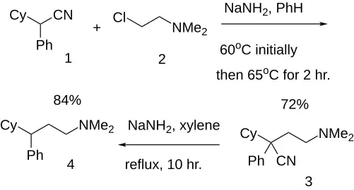 - ↑ Ruddy, A. Wayne (1951). "Antispasmodics. II. Substituted α-(β-Aminoethyl)-phenylacetonitriles and 3-Phenylpropylamines". Journal of the American Chemical Society. 73 (9): 4096–4098. doi:10.1021/ja01153a013.