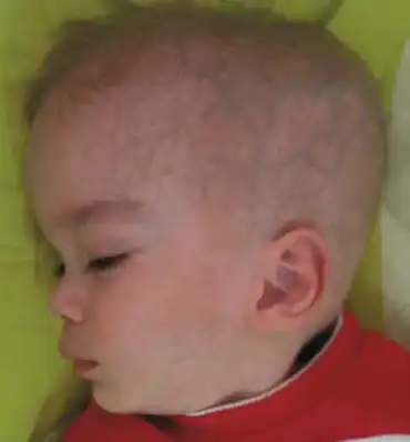 | GM2-gangliosidosis- with a dysmorphic face, protruding forehead, depressed nasal bridge | |