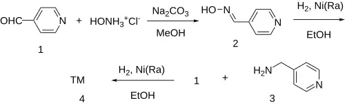 The oxime formation between isonicotinaldehyde [872-85-5] (1) and hydroxylamine gives 4-Pyridinealdoxime [696-54-8] (2). This is then reduced by catalytic hydrogenation over Raney-Nickel into 4-Picolylamine [3731-53-1] (3). Reductive amination of the last with a second equivalent of isonicotinaldehyde affords gapicomine (4).