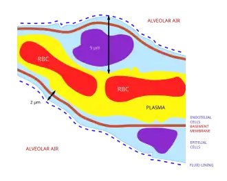 The membrane across which gas exchange takes place in the alveoli (i.e. the blood-air barrier) is extremely thin (in humans, on average, 2.2 μm thick).[14] It consists of the alveolar epithelial cells, their basement membranes and the endothelial cells of the pulmonary capillaries (Fig. 4).[14][16] The large surface area of the membrane comes from the folding of the membrane into about 300 million alveoli, with diameters of approximately 75–300 μm each. This provides an extremely large surface area (approximately 145 m2) across which gas exchange can occur.[14]