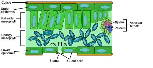 Plant gas exchange occurs mostly through the leaves. Gas exchange between a leaf and the atmosphere occurs simultaneously through two pathways: 1) epidermal cells and cuticular waxes (usually referred as 'cuticle') which are always present at each leaf surface, and 2) stomata, which typically control the majority of the exchange.[37] Gases enter into the photosynthetic tissue of the leaf through dissolution onto the moist surface of the palisade and spongy mesophyll cells. The spongy mesophyll cells are loosely packed, allowing for an increased surface area, and consequently an increased rate of gas-exchange. Uptake of carbon dioxide necessarily results in some loss of water vapor,[38] because both molecules enter and leave by the same stomata, so plants experience a gas exchange dilemma: gaining enough CO