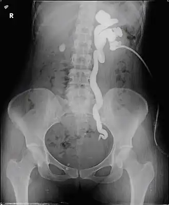 A retrograde pyelogram is a medical imaging procedure in which a radiocontrast agent is injected into the urethra in order to visualize the urinary bladder, ureter, bladder, and kidneys with fluoroscopy or radiography, using plain X-rays.[13] The flow of contrast (up from the bladder to the kidney) is opposite the usual outbound flow of urine, hence the retrograde ("moving backwards") name.
