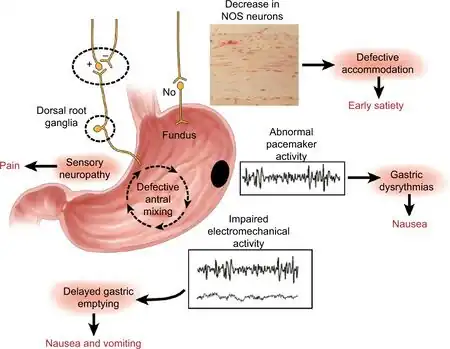- Impaired electromechanical activity in the myenteric plexus is responsible for delayed gastric emptying, resulting in nausea and vomiting.[20]