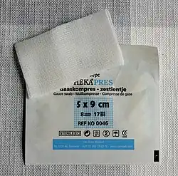 Gauze is a thin, translucent fabric with a loose open weave. In technical terms, "gauze" is a weave structure in which the weft yarns are arranged in pairs and are crossed before and after each warp yarn, keeping the weft firmly in place.[1] This weave structure is used to add stability to the fabric, which is important when using fine yarns loosely spaced. However, this weave structure can be used with any weight of yarn, and can be seen in some rustic textiles made from coarse hand-spun plant fiber yarns. Gauze is widely used for medical dressings.