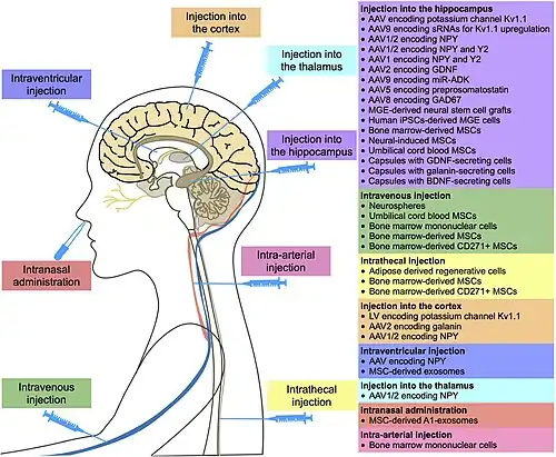 - ↑ 14.0 14.1 Löscher W, Gernert M, Heinemann U (February 2008). "Cell and gene therapies in epilepsy--promising avenues or blind alleys?". Trends in Neurosciences. 31 (2): 62–73. doi:10.1016/j.tins.2007.11.012. PMID 18201772. S2CID 33488218.