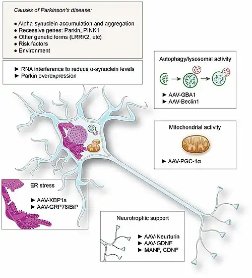 - ↑ 3.0 3.1 3.2 3.3 Feng, LR; Maguire-Zeiss, KA (March 2010). "Gene therapy in Parkinson's disease: rationale and current status". CNS Drugs. 24 (3): 177–92. doi:10.2165/11533740-000000000-00000. PMC 2886503. PMID 20155994.