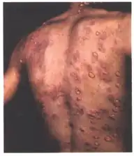 Generalized bullous fixed drug eruption (GBFDE) most commonly refers to a drug reaction in the erythema multiforme group.[3]: 129 These are uncommon reactions to medications, with an incidence of 0.4 to 1.2 per million person-years for toxic epidermal necrolysis and 1.2 to 6.0 per million person-years for Stevens–Johnson syndrome.[3]: 129 The primary skin lesions are large erythemas (faintly discernible even after confluence), most often irregularly distributed and of a characteristic purplish-livid color, at times with flaccid blisters.[2]: 554