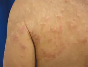 | Erythematous papules more evident on upper trunk | |