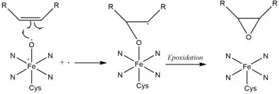 GphK is a member of the cytochrome p450 superfamily and is suspected to carry out the epoxidation of the C12-C13 olefin. Such epoxidation in post-PKS modifications has been seen in epothilone biosynthesis by EpoK.[2] In EpoK, the consensus mechanism of epoxidation by P450 involves the formation of a pi-complex between an oxoferryl pi-cation radical species (FeIV) and the olefin pi bond, followed by electron transfer, formation of the olefin pi-cation radical and finally epoxidation.[7]