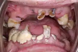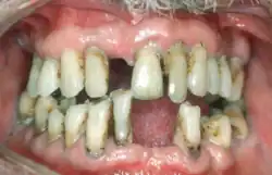 Although there is a decrease in the rate of edentulism, geriatric patients typically have high levels of plaque, calculus and debris, as they are functionally dependent on others or have lost the capacity to complete tasks such as toothbrushing thoroughly. Consequently, this results in an increased caries prevalence.[12] Dental caries is a process in which enamel is dissolved by acid producing bacteria. In 2004–2006, the average DMFT (decayed, missing and filled teeth) for adults in Australia over the age of 65 was found to be 23.7%.[12] An individual's caries risk is influenced by their sugar intake, frequency of eating, oral hygiene levels, saliva flow and function and recession. Gingival recession is a significant finding in older adults because the exposed root surface is more susceptible to root caries and therefore increases the risk for the patient. In 2015, 95.2% of Australians over the age of 75 had at least one site with gingival recession.[12] Additionally, periodontal disease prevalence was also great as 26.0% of the geriatric population was diagnosed with active periodontal disease.[12]